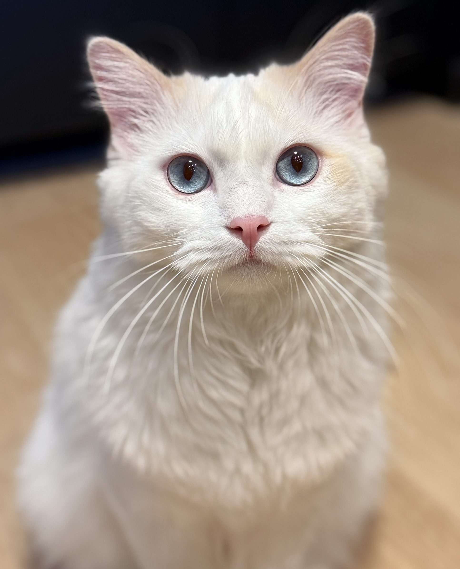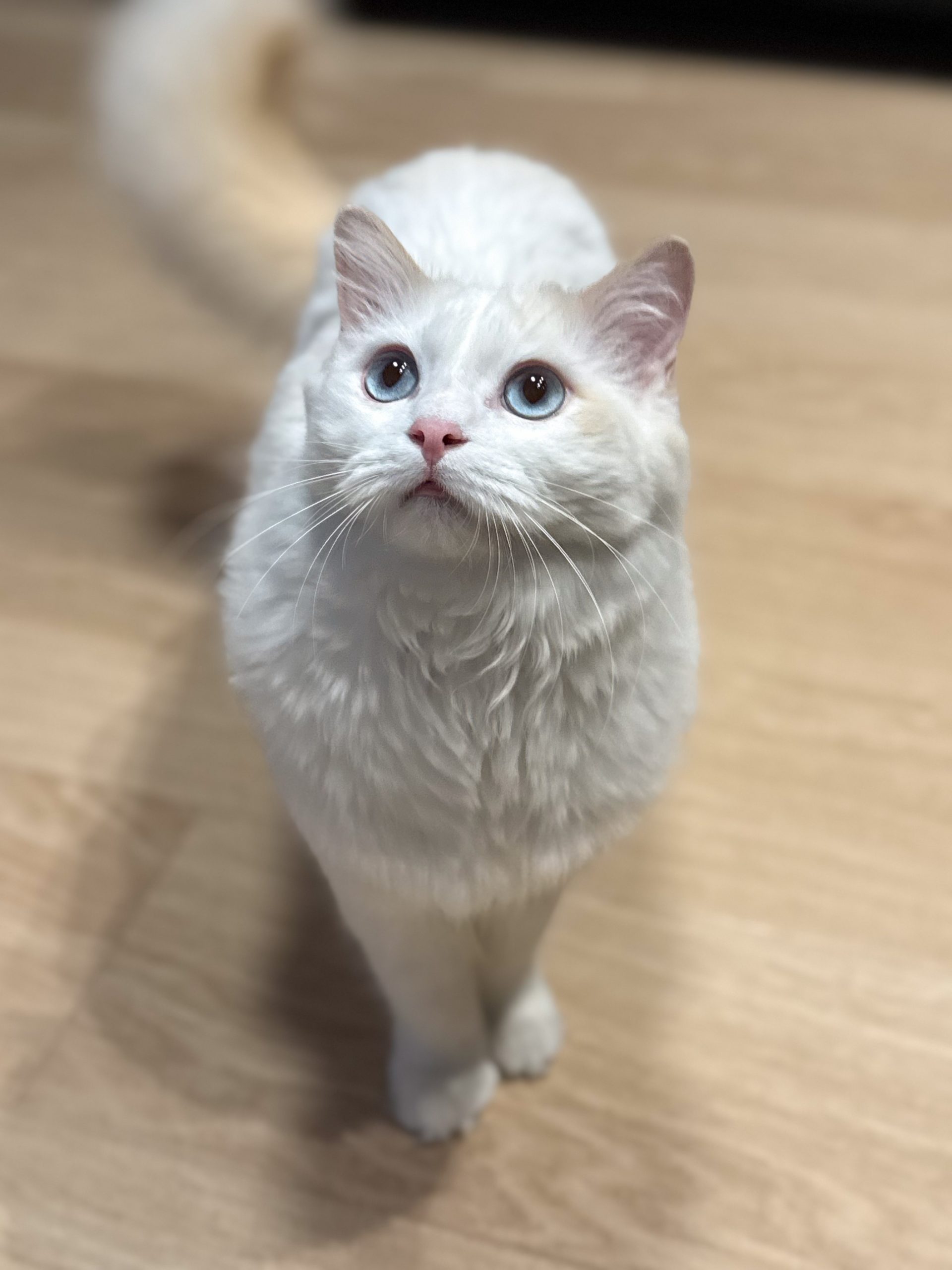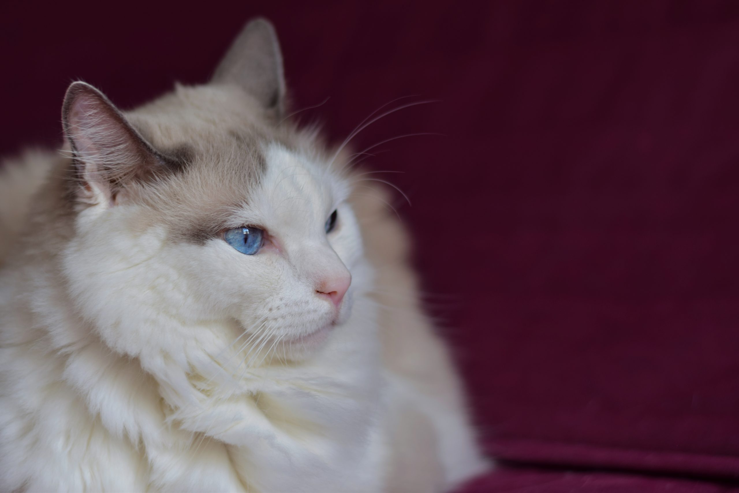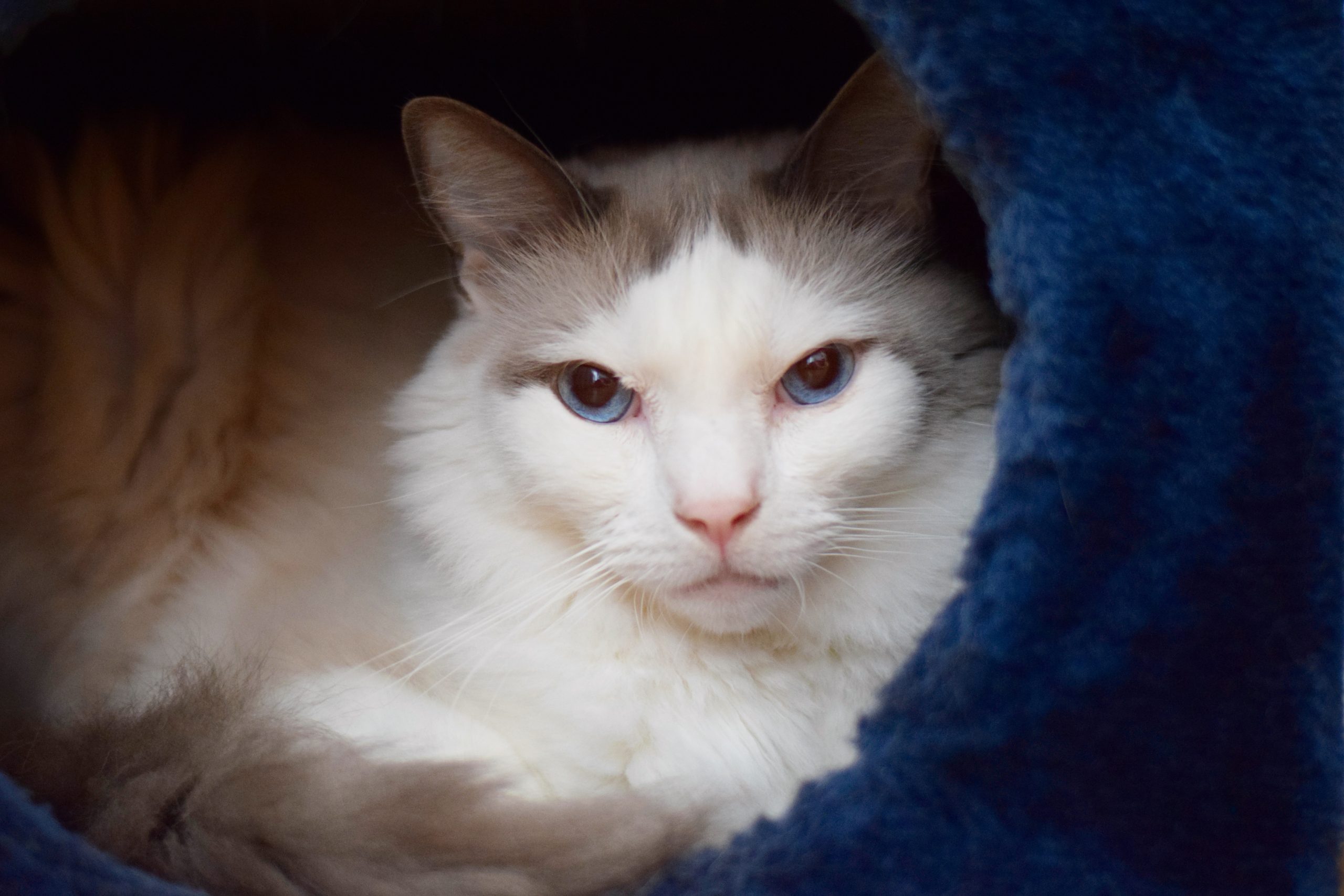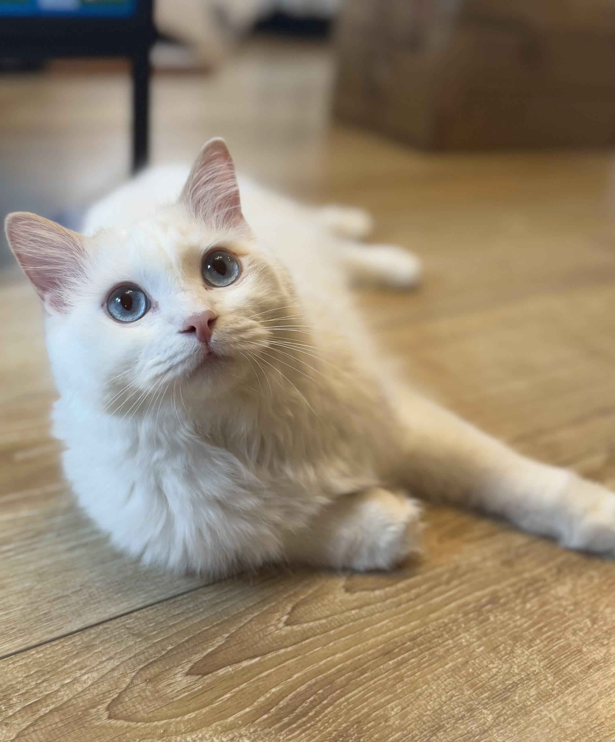 Dopełnieniem pastelowej, puszystej sierści są olbrzymie, migdałowe oczy w kolorze błękitu.