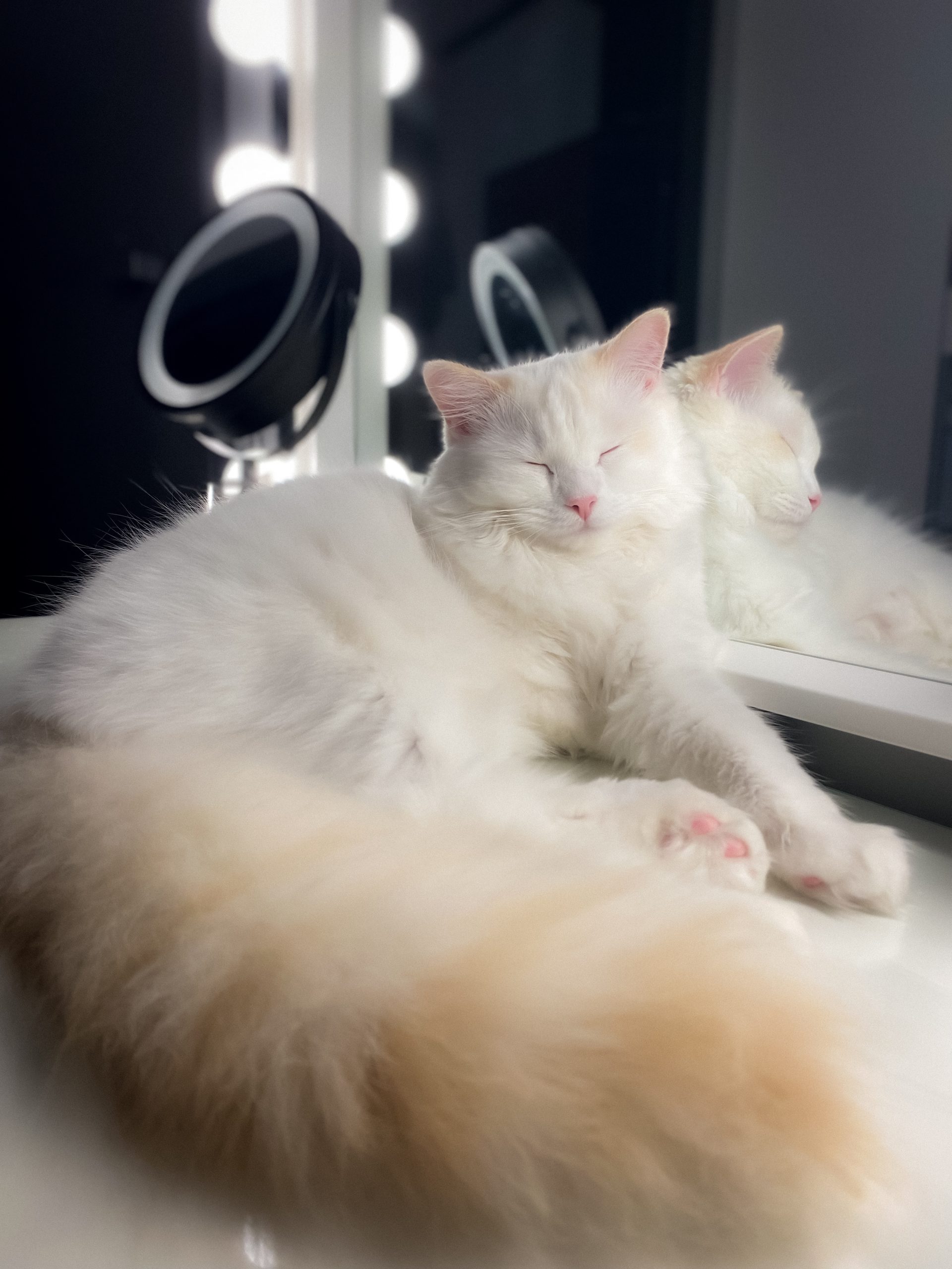 Kair to dorodny kocur o wyjątkowo pięknym futrze przypominającym w dotyku zimny jedwab i imponująco długiej, puszystej kicie. To kot o pięknym i rzadko spotykanym umaszczeniu w kolorze bicolour cream.