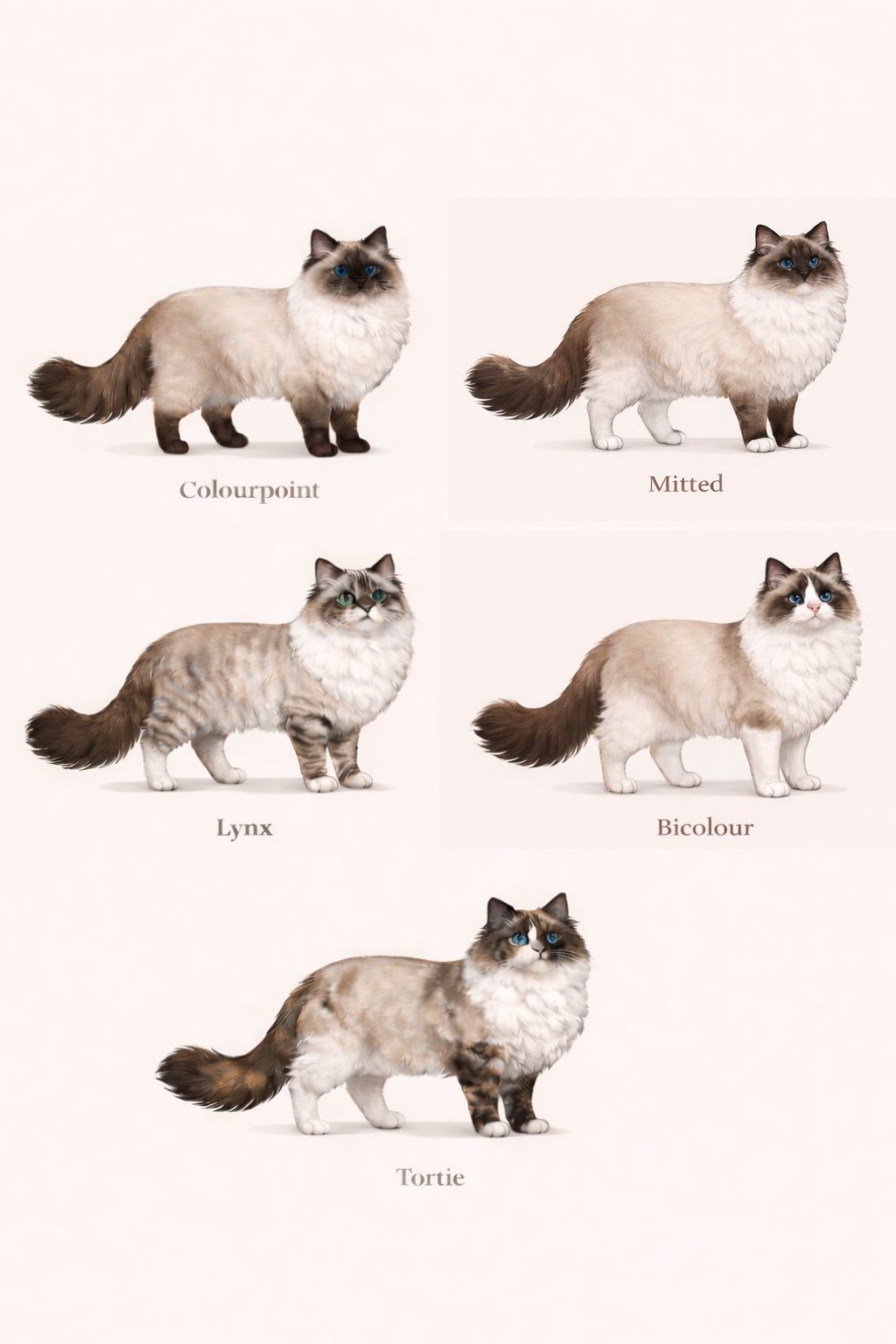 • Colourpoint —Wyróżnia się charakterystycznym kontrastem między jaśniejszym ciałem, a ciemniejszymi „pointami”, czyli uszami, maską na pyszczku, łapami i ogonem. To umaszczenie nie ma białych znaczeń!