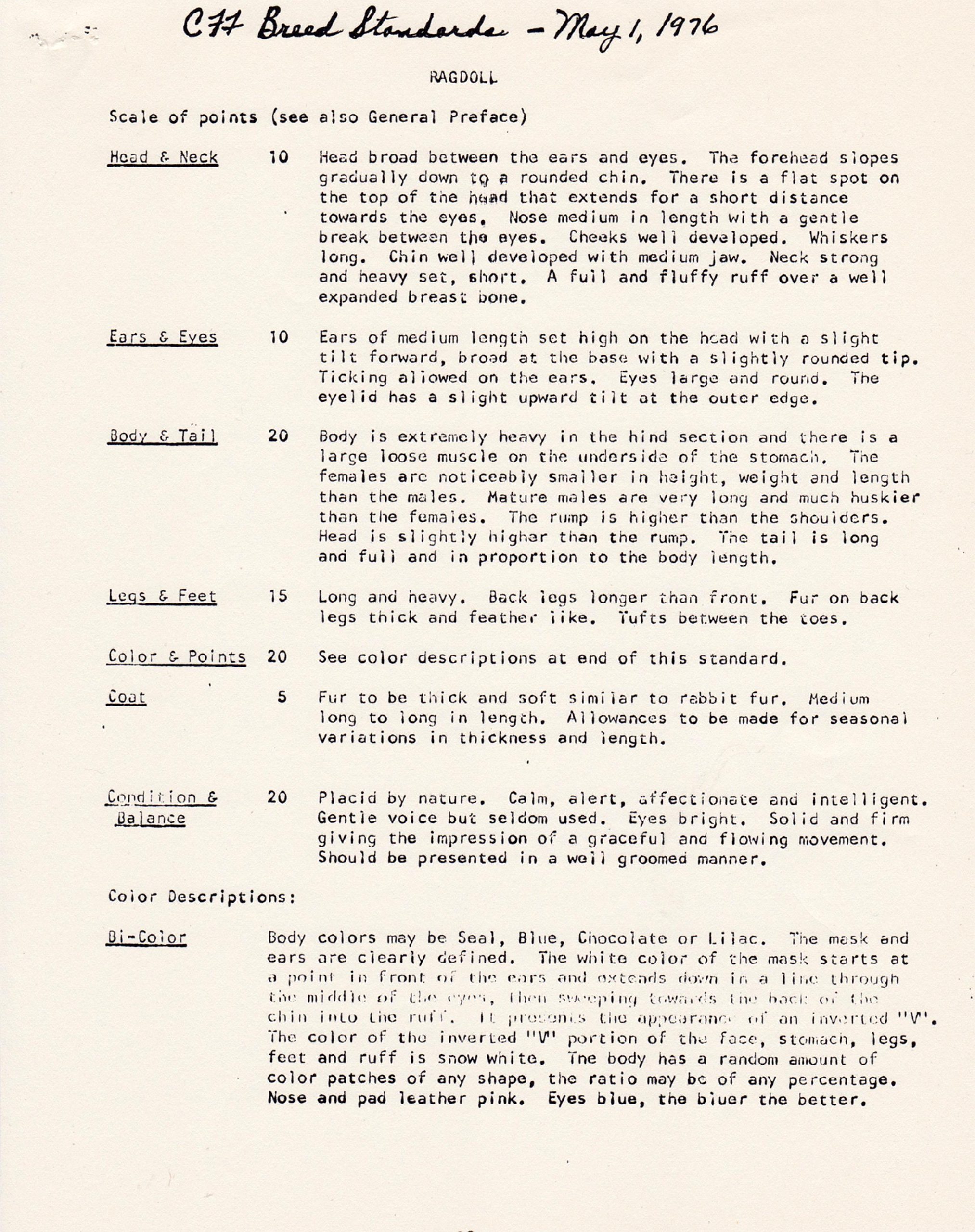 Ciało powinno być masywne, muskularne i długie. Tylne łapy dłuższe od przednich co powoduje charakterystyczną dla ragdolli postawę i sposób chodzenia.