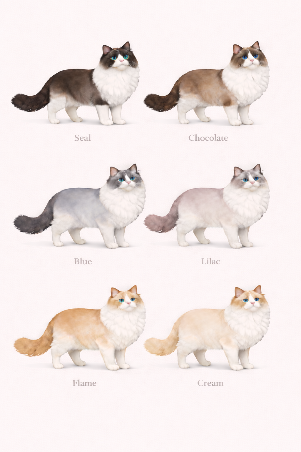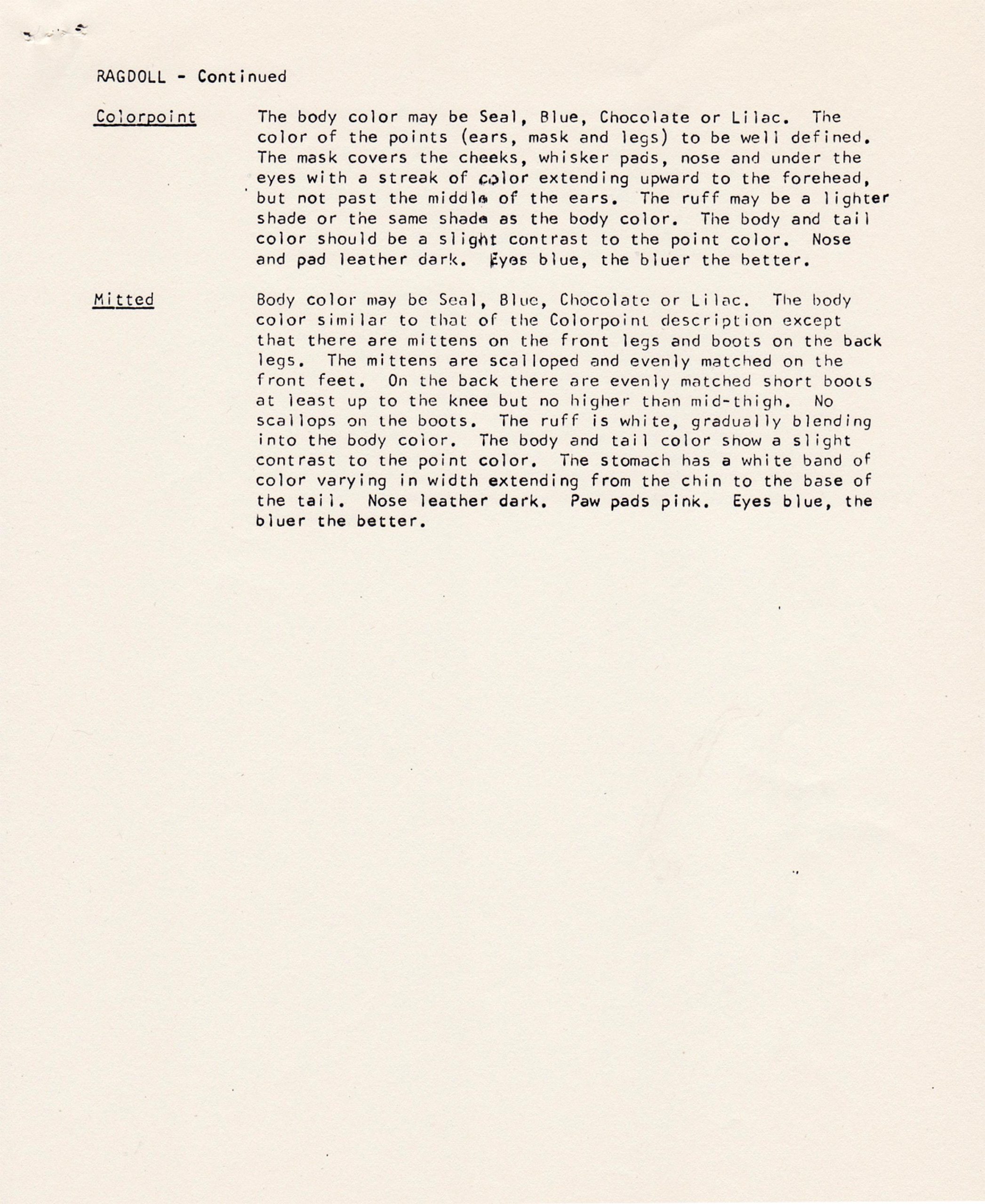 Ragdolle rodzą się praktycznie białe. Kolor pojawia się z czasem. Najszybciej wybarwiają się te o ciemnych umaszczeniach. Pełny kolor i jego końcowe rozłożenie kot osiąga po uzyskaniu pełnej dojrzałości.